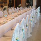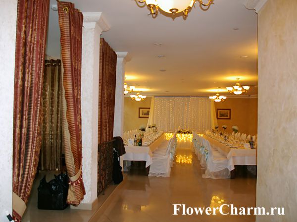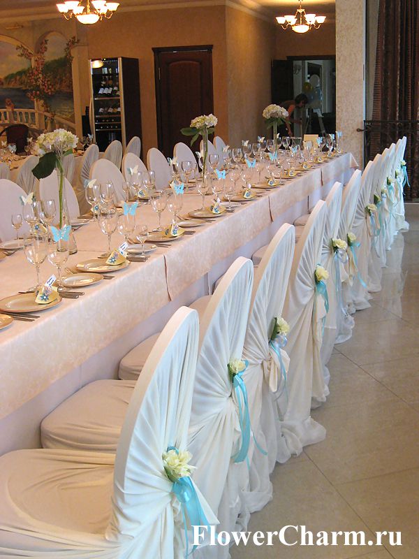 Для оформления свадьбы молодые люди выбрали золотисто-голубую гамму. Бело-голубая гортензия стала основным цветком флористического декора. Композиция из гвоздик, бледно-лимонных хризантем, гортензии, ягод дерена, кремовых роз и зелени стала украшением стола молодоженов. Одиночные гортензии в небольших изящных вазах сделали столы гостей более нарядными. Бутоньерки из гвоздик украсили спинки стульев. Подробнее ознакомиться с нашими услугами по оформлению свадеб цветами Вы можете здесь.