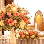 Мы дополнили убранство зала цветочными композициями в розово-кремовой гамме на высоких подсвечниках с золотой патиной, которые прекрасно вписались в интерьер. Пышные розы, тюльпаны, лизиантус и альстромерия в сочетании со светлой зеленью питтоспорума смотрелись нежно и в то же время парадно. Фуршетный стол украсили букеты из роз и альстромерии в невысоких вазах. Низкая композиция с ниспадающим плющом выглядела на столе молодоженов изысканно и соответствовала стилю оформления.